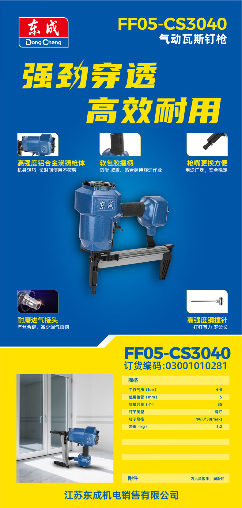 东成气动瓦斯枪混泥土射钉枪水泥水电吊顶门窗专用气动钢钉枪射钉器 FF05-CS3040