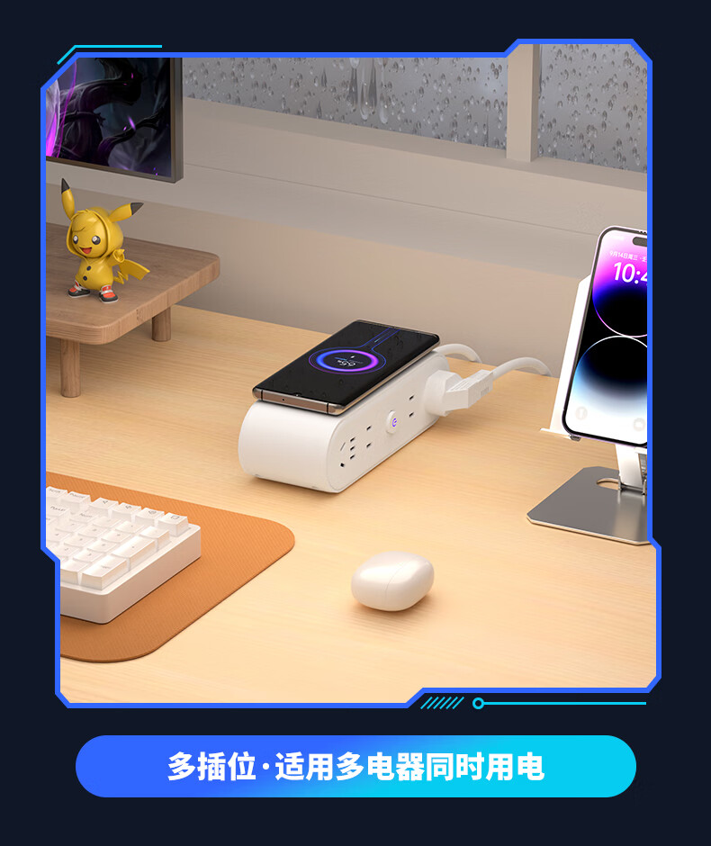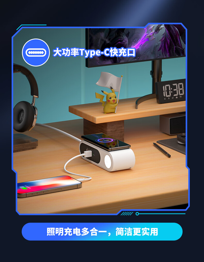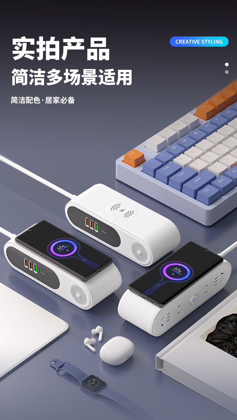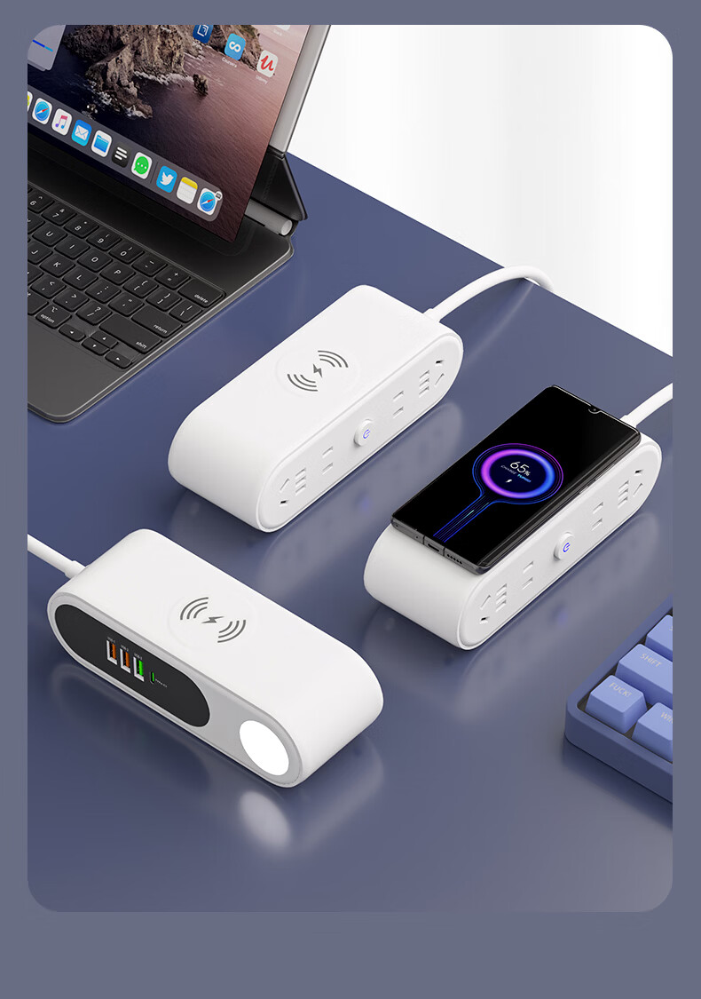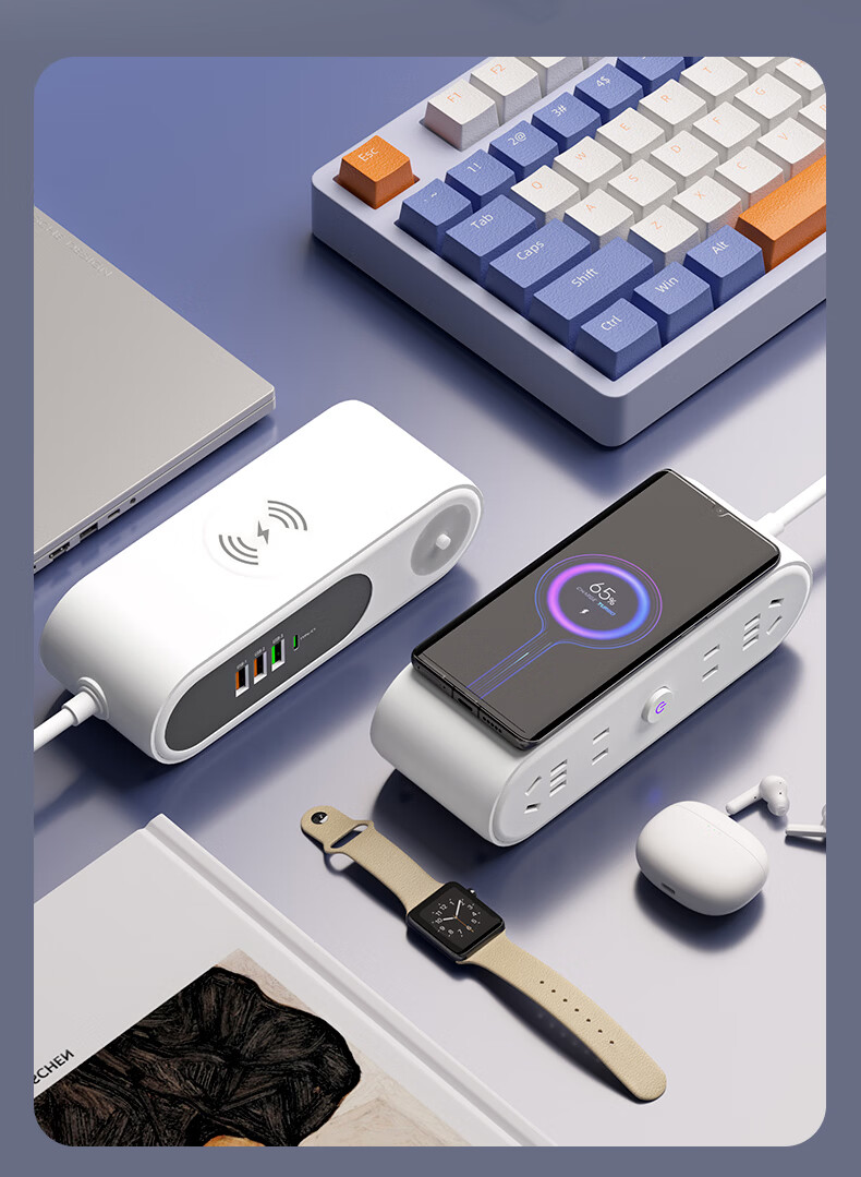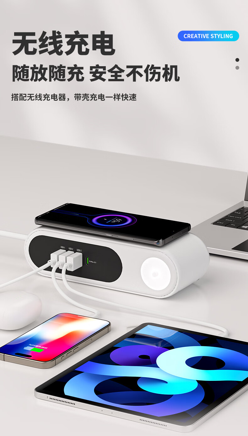 苏士赫尔摩一件包邮【55W 超级快充】无线充桌面充电站 - 3USB+Type-C+4位插排,总控白,多设备快充一体 夜灯插座 4位0.8米(功能少)