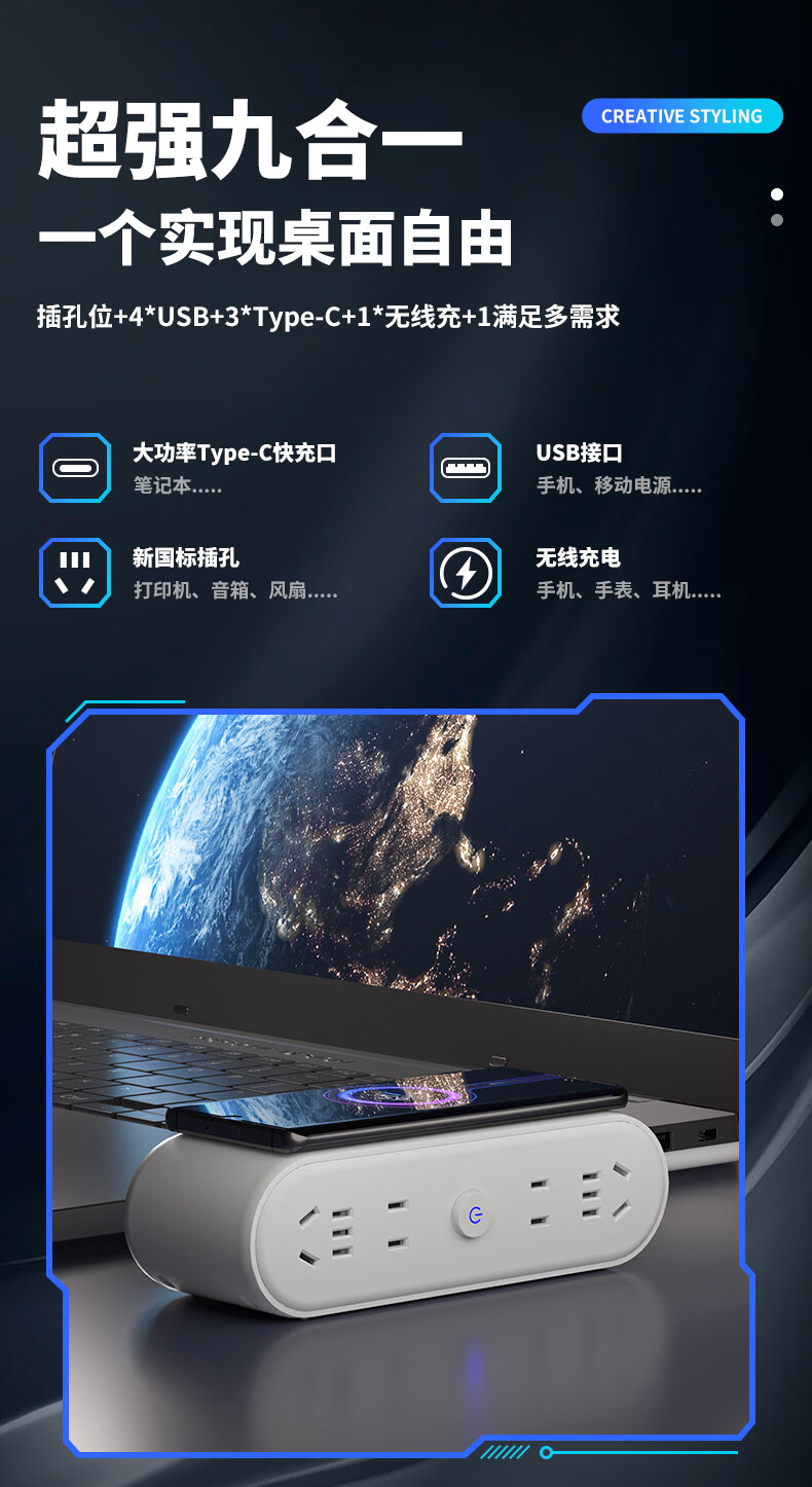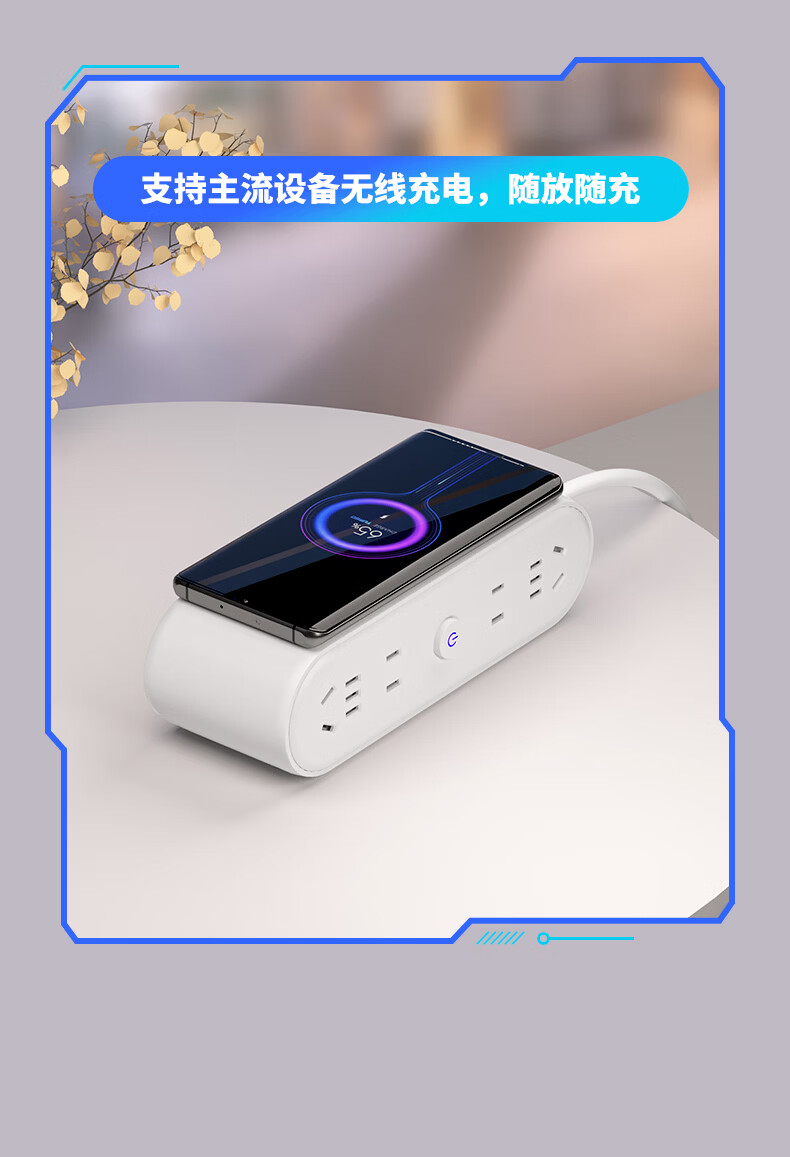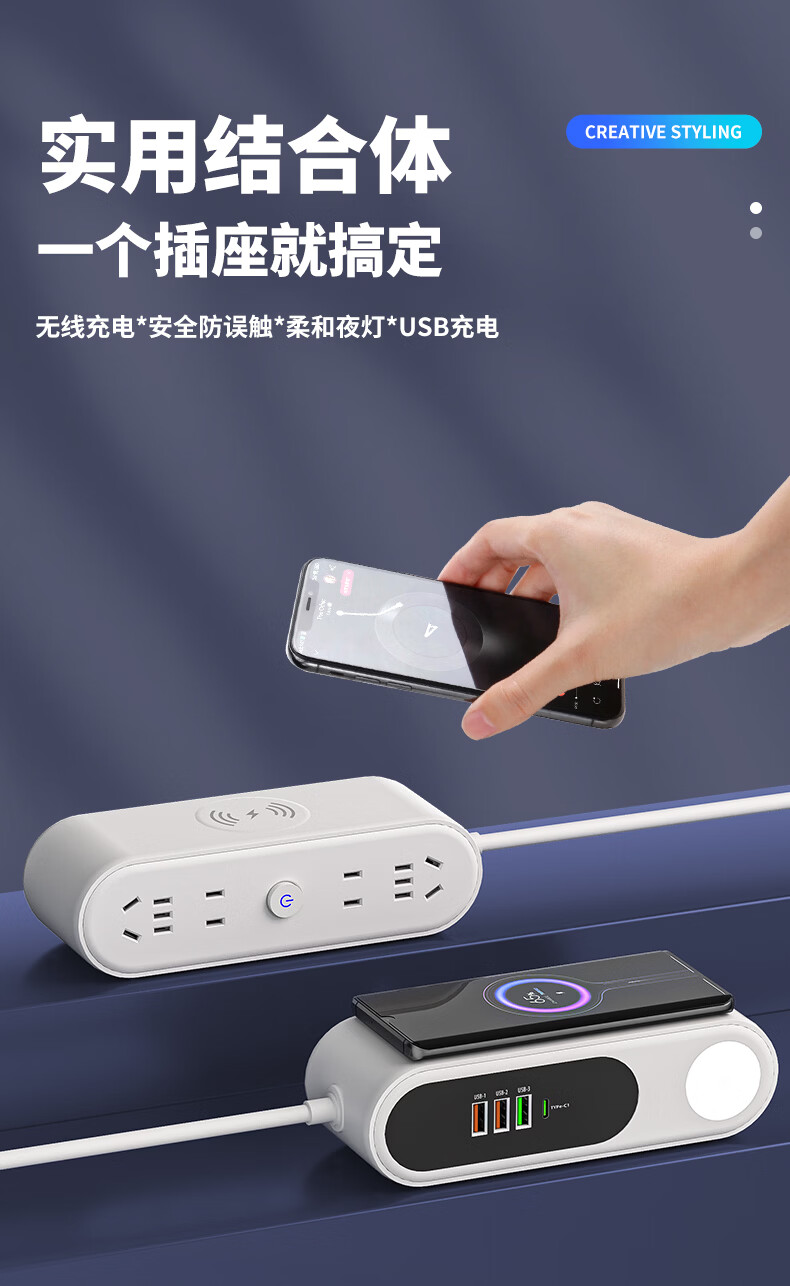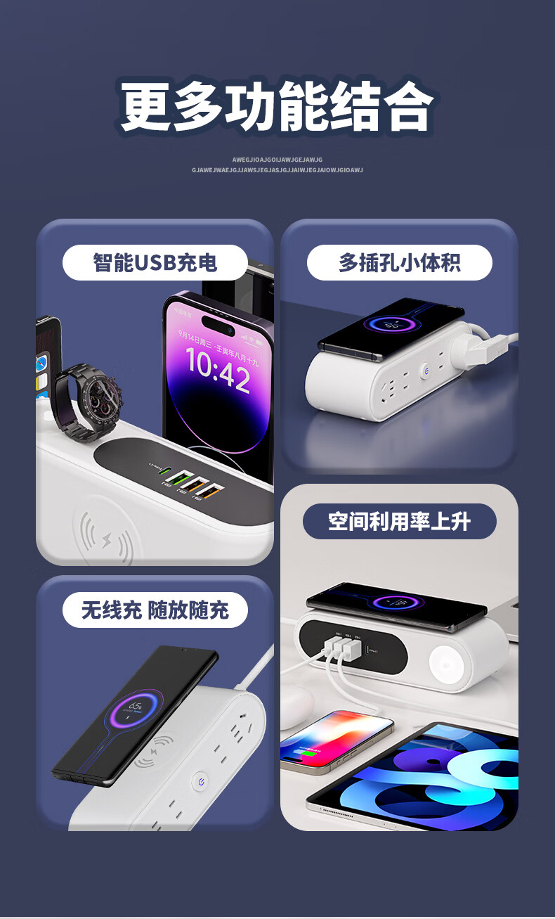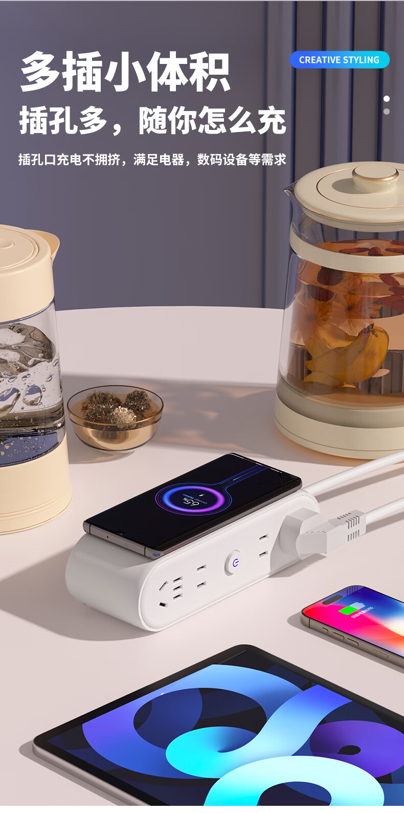 苏士赫尔摩一件包邮【55W 超级快充】无线充桌面充电站 - 3USB+Type-C+4位插排,总控白,多设备快充一体 夜灯插座 4位0.8米(功能少)