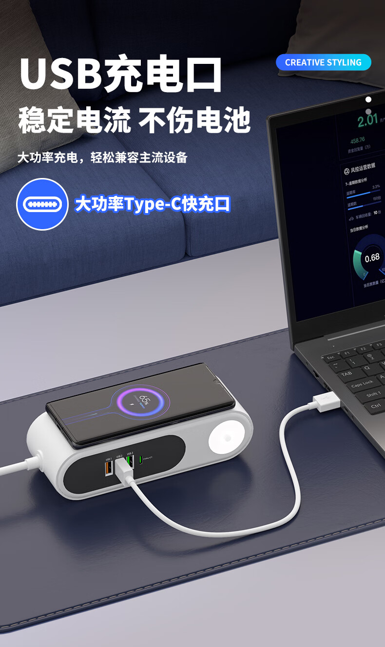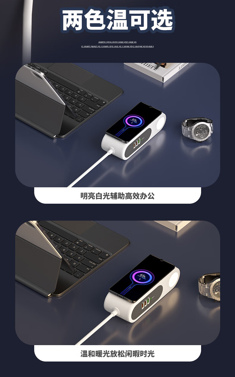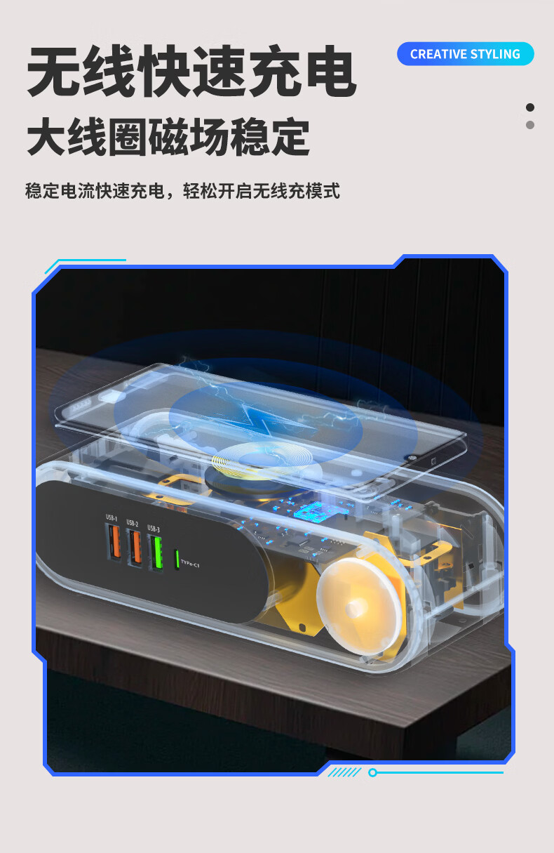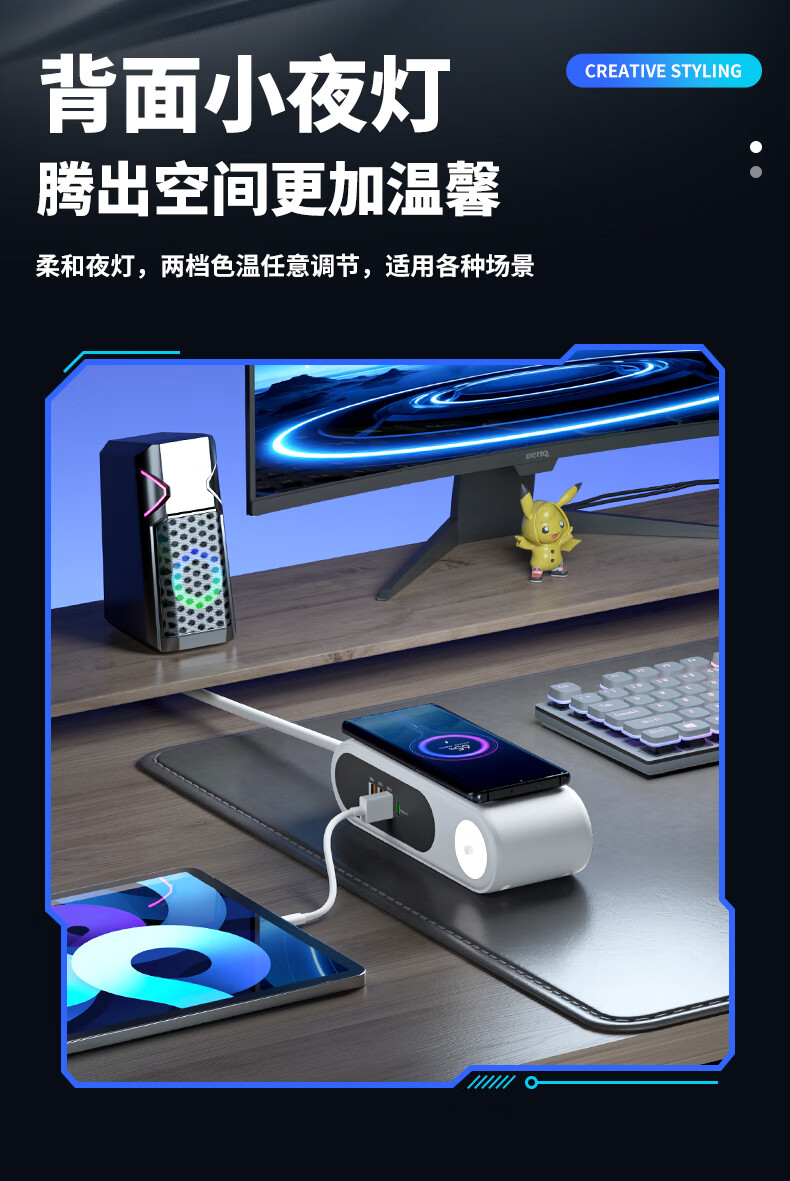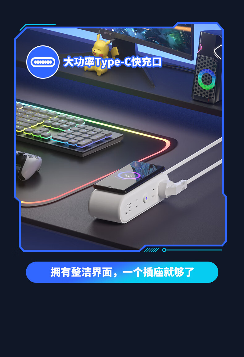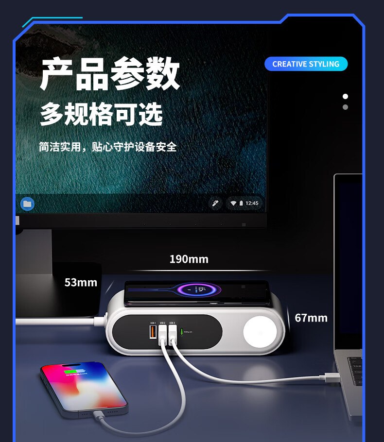 苏士赫尔摩一件包邮【55W 超级快充】无线充桌面充电站 - 3USB+Type-C+4位插排,总控白,多设备快充一体 夜灯插座 4位0.8米(功能少)