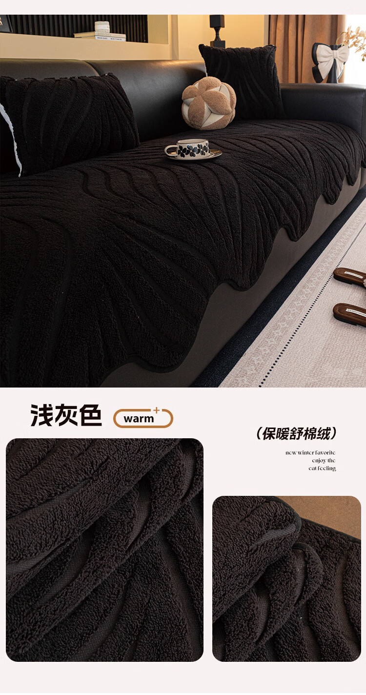 缔卓怡高级感沙发盖布巾2026新款秋冬季坐垫全盖防滑毛绒毯子皮沙发套罩 惜花-黑色 180cm*130cm (适用于单人位/脚踏)