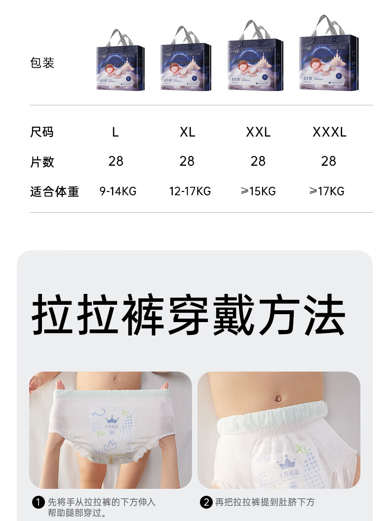 十月结晶菌护奢柔拉拉裤益生菌超薄透气新生儿婴儿尿不湿XXXL码28片